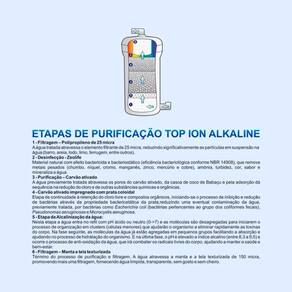Purificador de água alcalina e ozonizada. Transforma água comum em água alcalina com pH entre 8.5 e 9.5. Água ionizada com baixo teor de cloro e flúor. Filtra, purifica, mata bactérias, elimina metais pesados, remove impurezas e materiais orgânicos, preserva sais minerais. Tecnologia de super Ozônio (O3) com ação bactericida. Ideal para purificação de alimentos. Benefícios: Prevenção do envelhecimento, aumento da hidratação, eliminação de toxinas, melhora da capacidade cognitiva, favorece a digestão, melhora da disposição física, auxilia na redução da hiperacidez gástrica, combate a retenção de líquidos, auxilia na absorção de alimentos. Água antioxidante (Redox Negativo). Aumenta a condutividade da água. Baixa tensão superficial (moléculas hexagonais).Função retrolavagem