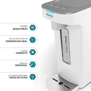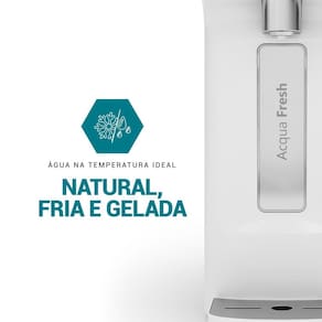 Sistema Acqua Fresh Refrigeração por placa eletrônica Painel touch com seleção de temperatura Indicador de troca de filtro: Sinaliza automaticamente ao atingir 2000L ou 6 meses Filtro Troca-Fácil Design compacto Compatibilidade com vários recipientes Bandeja removível Sistema Easy Clean Reservatório interno de 800ml Luz indicadora de funcionamento Bivolt 70W de potência.