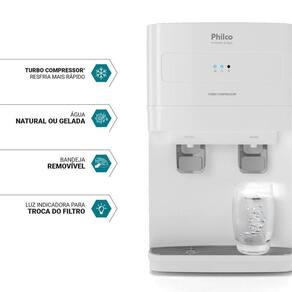 Sistema de refrigeração por compressor turbo com gás R600a. Filtro Classe A com carvão ativado e membrana UF. Luzes indicadoras de funcionamento e troca de filtro. Bandeja coletora removível. Sistema Easy Clean. Tomada 10A com 3 pinos.Função retrolavagem