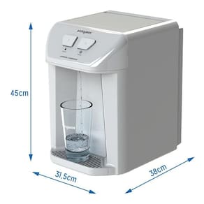 Purificador de água com compressor, refil alcalino (pH > 8.5), estrutura em ABS e acabamento em acrílico. Vazão nominal de 60 L/h, redução de cloro livre, Classe C de retenção de partículas. Vida útil do refil de 3.000 litros ou 6 meses.Função retrolavagem