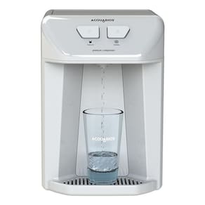 Purificador de água com compressor, refil alcalino (pH > 8.5), estrutura em ABS e acabamento em acrílico. Reduz cloro livre e partículas classe C. Vazão nominal de 60 L/h. Capacidade de refrigeração de 1 L/h. Reservatório de 1,2 litros.Função retrolavagem