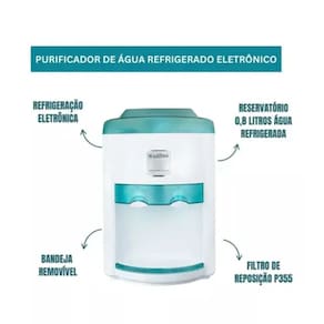 Purificador de água refrigerado eletrônico, com sistema de refrigeração eletrônico inteligente para estabilidade da temperatura e menor consumo de energia. Filtro bacteriostático com carvão ativado de coco de babaçu, fácil de trocar. Bandeja removível.Função retrolavagem