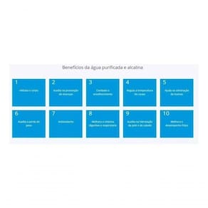 Purificador de água alcalina com ozônio, pH 9.5. Tecnologia Blueoxi 2 em 1. Libera ozônio para purificação de alimentos e água. Elemento filtrante com 8 etapas: polipropileno, carvão ativado com prata coloidal, tela texturizada, zeolife, manta, carvão ativado de coco babaçu, manta e alcalinização. Água antioxidante, melhora hidratação, disposição e auxilia na prevenção de doenças.Função retrolavagem