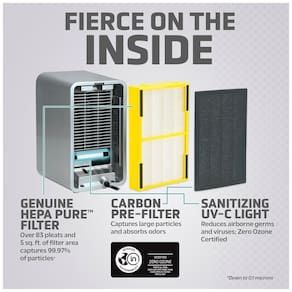 REDUZ OS GERMES a luz UV C ajuda a matar vírus transportados pelo ar, como Influenza, staph, rinovírus e funciona com o dióxido de titânio para reduzir os compostos orgânicos voláteis. A luz UV C opcional fornece defesa adicional contra germes e esporos de fungos