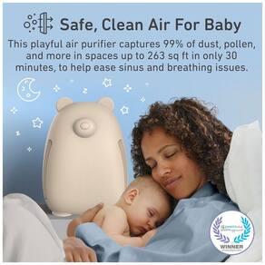 O Purificador de Ar Pure Enrichment PureBaby Kids Bear Sweet Oat oferece filtragem eficiente em até 24 m², ideal para berçários, quartos e ambientes infantis. O sistema de 4 estágios inclui pré-filtro de carvão ativado, filtro HEPA verdadeiro, revestimento prolongador de vida útil e luz UV-C opcional, removendo até 99,97% de partículas, alérgenos e microorganismos. Apresenta design lúdico e seguro, com trava de proteção para crianças, painel touch, 3 velocidades de ventilação, temporizador, modo noturno e iluminação ajustável em sete cores suaves. Modelo compacto, fácil de posicionar em móveis, acompanha lâmpada UV, manual e garantia de 5 anos Pure Enrichment.