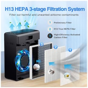 Equipado com um sistema de filtragem avançado de 3 estágios, o E300L possui um pré-filtro para partículas grandes, um filtro H13 True HEPA que captura quase todas as partículas do ar com tamanho de 0,3 mícrons, eliminando poeira, pólen e pelos de animais de estimação, além de um filtro de carvão ativado de alta eficiência que remove vapores tóxicos e odores desagradáveis.