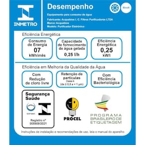 Purificador eletronico premium dark bivolt acquabios CaracterísticasVazão nominal - 20 l/hPressão - 50 a 400 kpaRedução do cloro livre - aplicávelPossui eficiência bacteriológicaClasse de retenção de partículas - classe aVida útil do refil - 1.500 lRefil girou trocouRefil alcalinoSaída de água com iluminaçãoBivolt