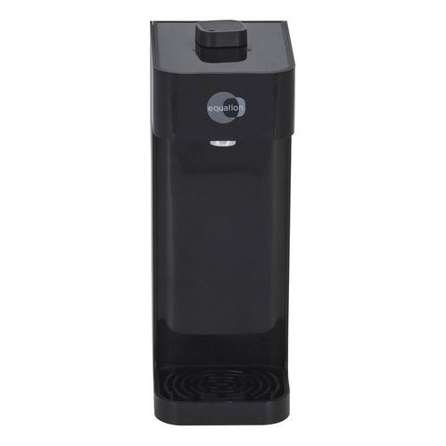 Purificador de água Equation JOE com filtragem por pressão, retém partículas de Classe C e reduz cloro livre. Opera sem energia elétrica, com refil substituível a cada 12 meses. Design compacto na cor preta.Bica móvel