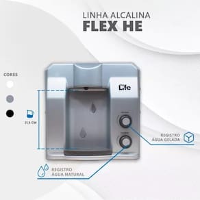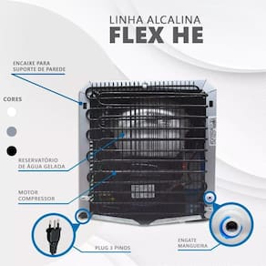 O Purificador Flex HE de Água Alcalina Ionizada oferece água em sua forma mais pura, sem cheiro, sem gosto e sem cor. Ele tem como características a mais alta tecnologia em filtragem de água, o seu poderoso processo alcalinizador e o eficaz sistema de refrigeração.