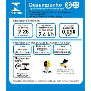 Purificador de água Top Life Health Energy, alcalina e ionizada, com pH entre 8.5 e 9.5, baixo teor de cloro e flúor, água 7x mais hidratante e antioxidante. Modelo em aço, disponível em 220V.Função retrolavagem