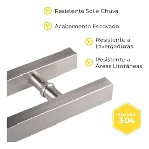 Super resistente podendo ser utilizado em regiões litorâneas, ficar exposto a sol e chuva que não haverá problemas de manchar ou enferrujar, devido ao seu material de aço inox com um lindo acabamento escovado, indicado para vários modelos de portas, como pivotante, portas comuns de madeira, portas de vidro, portas de alumínio, portas de aço, portas de correr e portões.