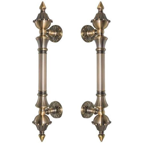 Características técnicas: - Comprimento: 335mm - Largura: 48mm - Profundidade: 70mm - Distância entre furos: 190mm - Peso par : 0,97kg - Material: zinco - Cor: bronze antigo - Acompanha: peças para instalação - Quantidade: par de puxadores para os 2 lados da porta puxador duplo - Marca: Máxima Metais