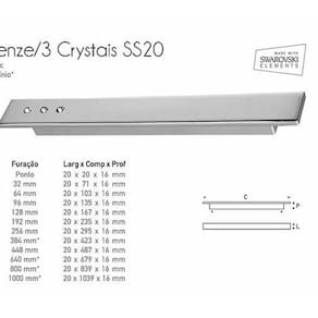 Puxador Firenze Swarovisk 384 Mm Escovado - GruppaO Puxador facilita na abertura e o fechamento de portas de armários e gavetas. Trazem para o móvel a funcionalidade e beleza, tornando-se muitos projetos, um elemento indispensável. Material:zamac Acabamento:escovado Comprimento:423mm Largura:16mm Comprimento entre furos: 384mm