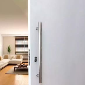 O Puxador Para Porta Inox 304 Prata Pivotante 40Cm Redondo é ideal para portas pivotantes de madeira, portas comuns de madeira, portas de vidro temperado, esquadrias de alumínio, esquadrias de aço e portões em aço e alumínio.