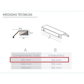 Puxador em alumínio para móveis firenzedescrição técnica:- material: alumínio- modelo: firenze 7015- puxador angulo 45º- medidas disponiveis: 82mm furo a furo 64mm , 146mm furo a furo 128mm , 210mm furo a furo 192mm disponível em outros anuncios - espessura: 1,3mm- parafuso para instalação: 4,0 x 16mm não inclusos características: puxador ideal para qualquer tipo de móvel. Funciona em portas de bater ou de correr ou frentes de gavetas com limitide máximo de espessura em 18mm da porta/gaveta.Diferencial:puxador primeiramente é cortado depois tem suas pontas abauladas, escareado na parte traseira e posteriormente lixado, após todo esse processo recebe a anodização/pintura, por isso ele é 100% na cor, até mesmo as laterais. Opções: Cores disponíveis em outros anúncios: preto, anodizado cinza , inox escovado bronze claro , rose gold cobre , branco e dourado Medidas disponiveis em outros anuncios : 82mm furo a furo 64mm , 146mm furo a furo 128mm , 210mm furo a furo 192mm