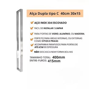O Puxador Inox Escovado Modelo C de 30x15 40cm é uma escolha elegante e versátil para sua porta. Com um acabamento escovado de alta qualidade, ele adiciona um toque de sofisticação ao seu ambiente. O design do Modelo C oferece um visual moderno e elegante. Sua instalação é fácil e segura, e sua durabilidade garante que você desfrute de sua beleza por muito tempo. Transforme sua porta com o Puxador Inox Escovado Modelo C de 30x15 40cm e adicione um toque de estilo único. Especificações Técnicas: Material: Aço inoxidável Acabamento: Escovado Tamanho: 41,5 cm Distância entre furos: 40 cm Espessura: 30 mm Largura: 15 mm Modelo: C Fixação: Parafusos inclusos Aplicação: Portas pivotantes de madeira ou vidro Instalação: Fácil e segura Durabilidade: Alta Acompanha chave Allen e 2 parafusos de 7 cm para portas com maior espessura.