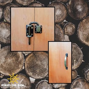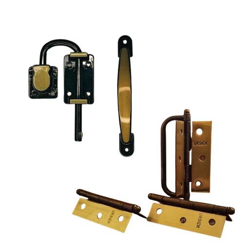 O kit inclui duas dobradiças simples, uma dobradiça com alça para facilitar a abertura da porta e parafusos para fixação.