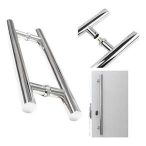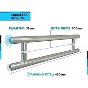 Material: aço inoxidável Acabamento: polido Diâmetro: 32 mm Formato: redondo Tamanho: 45 cm Distância entre furos: 30 cm Fixação: parafusos inclusos Aplicação: portas pivotantes de alumínio ou vidro ou madeira Durabilidade: alta