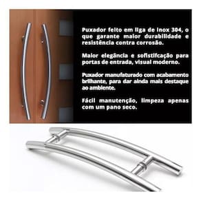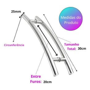 Material: aço inoxidável Acabamento: polido ou escovado, escolher após a compra Formato: curvo / tubular bellíssima Tamanho: 30 cm Distância entre furos: 20 cm Fixação: parafusos inclusos Aplicação: portas pivotantes de alumínio ou vidro ou madeira Durabilidade: alta