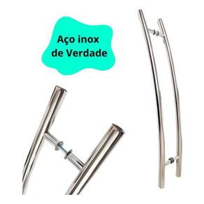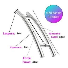 Material: aço inoxidável Acabamento: polido Formato: curvo / tubular bellíssima Tamanho: 60 cm Distância entre furos: 40 cm Fixação: parafusos inclusos Aplicação: portas pivotantes de alumínio ou vidro ou madeira Durabilidade: alta