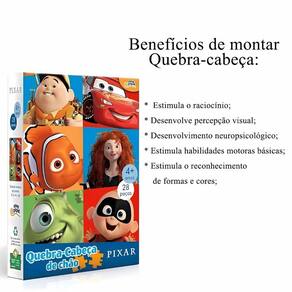 Puzzle De Chão 28 Peças Pixar - Toyster O Quebra-Cabeça de Chão Pixar 28 peças é uma forma divertida e educativa de mergulhar no mundo mágico da Pixar. Com suas peças grandes e fáceis de montar, ele é ideal para as crianças pequenas, que podem brincar e aprender ao mesmo tempo. O quebra-cabeça traz imagens vibrantes de personagens de filmes como Procurando Nemo, Os Incríveis, Monstros e Carros, permitindo que os pequenos se conectem com esses filmes de maneira lúdica. Além de ajudar a desenvolver a coordenação motora e o raciocínio lógico, é uma ótima oportunidade para as crianças se divertirem enquanto montam cenas cheias de cor e . .Código: 105506 Dimensões aprox. da embalagem em cm: 4x14x20 Peso liq. Aproximado do produto na embalagem: 210g Certificado Inmetro: 000520/2022 Referência do modelo: 8060 Conteúdo da embalagem: 01 Quebra Cabeça Contendo 28 Peças Composição/material: Papel, Papel . Idade recomendada: a partir de 4 anos. Garantia: 90 dias contra de fabricação pelo fabricante. Imagens meramente ilustrativas. As cores e tonalidades podem variar. Gênero - Meninas Meninos Unissex Idade - 4 anos 5 anos 6 anos Tipo - Puzzle Quantidade de Peças - Até 30 Peças