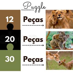 Puzzle Progressivo Animais e seus Filhotes Com 3 quebra-cabeças que contém simpáticas figuras de alguns animais e seus filhotes. A criança monta os quebra-cabeças e se diverte com a carinha dos personagens. Ao final da montagem, os três puzzles se complementam, formando uma grande e linda imagem dos animais. O Puzzle Progressivo traz na mesma caixa três quebra-cabeças diferenciados, em que as quantidades e os tamanhos das peças determinam níveis crescentes de dificuldade. As peças do verso também são diferentes, para facilitar a separação dos modelos. Inicie a montagem pelo quebra-cabeça de 12 peças, a fim de que a montagem das ilustrações de 20 e 30 peças ofereça um desafio progressivo e atraente.