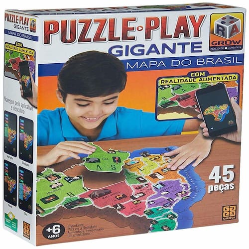 Além de estimular o raciocínio lógico e a concentração, o quebra-cabeça do Mapa do Brasil com realidade aumentada oferece às crianças um jeito divertido e interativo de aprender tudo sobre o nosso pais. O puzzle tem peças com formato dos estados, ilustrações de pontos turísticos e peculiaridades de cada região e um aplicativo de celular ou tablet que facilita à criança visualizar, em três dimensões, os distintos tipos de clima, vegetação, relevo e até a distribuição da população no território brasileiro.