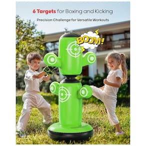 A superfície apresenta múltiplos alvos distribuídos na frente e nas laterais, permitindo golpes de soco e chute em diferentes alturas e direções, favorecendo coordenação motora e foco visual. A estrutura é fabricada em PVC com espessura aproximada de 0,42 mm e base alargada, projetada para ser preenchida com água, garantindo estabilidade e retorno rápido após os impactos.?