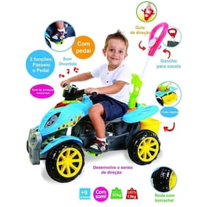Com o aro protetor, apoio de pés e empurrador, esse Quadriciclo Passeio e Pedal um carro seguro e divertido. O mini veículo também tem rodas com borracha para não derrapar, buzina e bagageiro!