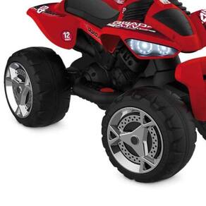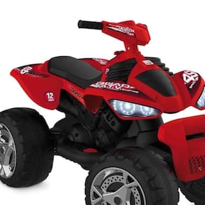O Quadriciclo Elétrico 12V leva a diversão dos pequenos aventureiros ao máximo! Com câmbio de duas velocidades + ré e aceleração progressiva no pedal, garante uma pilotagem suave e segura para muita diversão. Detalhes do produto: Design moderno e arrojado; Rodas grandes para maior estabilidade; Dois motores; Freio a motor; Câmbio de duas velocidades + ré; Manoplas emborrachadas; Dispositivo de proteção do sistema elétrico; Movido por bateria recarregável de 12V; Acompanha carregador 127/220V. Idade sugerida: +3 anos. Peso máximo suportado: 60 kg. Altura máxima sugerida: 1,19 m. Velocidade aproximada: 3-7 km/h.