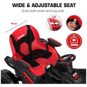 O veículo elétrico vem com um controle remoto 2.4G, permitindo que os pais controlem o carro se o filho for muito pequeno para dirigir. Há um botão P de emergência no controle remoto, para que você possa controlá-lo para parar ou desviar seus filhos de um perigo potencial. A criança também pode controlar o veículo usando o volante e o pedal.