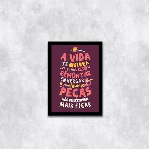 Quadro a vida te quebra pra você remontar 33x24cm - com vidro Moldura: madeira preta Informações do produto tire todas as suas dúvidas no descritivo abaixo: decoração para quarto, sala, cozinha, escritório, área gourmet e muito mais. Chega de paredes vazias medidas - cada peça tem 33x24cm a4 . Material do papel - papel fotográfico brilhante de altíssima resolução acabamento - todos os quadros são acompanhados de vidro para proteção da imagem. - moldura em madeira maciça na cor preta e pendurador . - os quadros são embalados de forma segura com plástico bolha com camada dupla de acordo com o tamanho dos quadros. - de 3 meses. Meu quadro chegou. Como posso fixá-lo Você precisa apenas de um martelo e um prego, pois os quadros já vão acompanhados de penduradores. Esta é a forma mais indicada. Como posso limpar meu quadro A limpeza é feita como um móvel comum da sua casa. Apenas um pano seco ou espanador são suficientes para tal Ean: 7895142221467