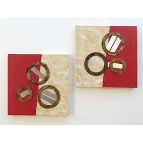 Vermelho vivo e tons pastéis. Painel (tela) com pintura acrílica com textura, e apliques em mdf e alumínio. Modelo de quadro abstrato ideal para sala, quarto, escritório, corredores, escadas e caixas de luz. Poderá ser utilizado como único, dupla ou trio.Valor unitário. Marca: Josue Quadros