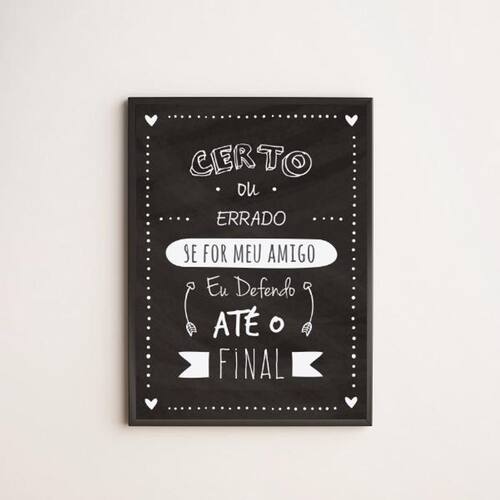 Quadro amigo até o final 24x18cm Moldura: madeira preta Informações do produto tire todas as suas dúvidas no descritivo abaixo: decoração para quarto, sala, cozinha, escritório, área gourmet e muito mais. Chega de paredes vazias medidas - cada peça tem 24x18cm a5 . Material do papel - papel fotográfico brilhante de altíssima resolução acabamento - todos os quadros são acompanhados de uma película de acetato para proteção da imagem. - moldura em madeira maciça na cor branca e pendurador móvel que pode ser retirado facilmente caso deseje fixar com fita dupla face. - os quadros são embalados de forma segura com plástico bolha com camada dupla de acordo com o tamanho dos quadros. - de 3 meses prazo de envio pedimos 24 horas úteis no máximo para enviar seu pedido após o envio, segue os prazos normais dos correios, cerca de 7 exceto para norte e nordeste, que pode ser de até 14 . Em diversas cidades, este prazo normalmente é reduzido, mas depende do prazo dos correios. Meu quadro chegou. Como posso fixá-lo Você precisa apenas de um martelo e um prego, pois os quadros já vão acompanhados de penduradores. Esta é a forma mais indicada. Caso prefira, você pode utilizar uma fita dupla face neste caso, sugerimos de alta qualidade para evitar que descole e seu quadro caia . Como posso limpar meu quadro A limpeza é feita como um móvel comum da sua casa. Apenas um pano seco ou espanador são suficientes para tal Marca: Não Informado