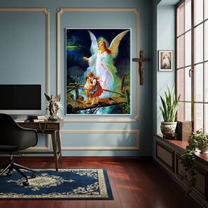 Quadro Anjo da Guarda Protegendo Crianças Ponte - 70x50cm - Cor: Moldura Preta