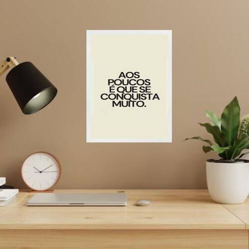 Quadro aos poucos se conquista muito 45x34cm - com vidro Cor: moldura preta Informações do produto tire todas as suas dúvidas no descritivo abaixo: decoração para quarto, sala, cozinha, escritório, área gourmet e muito mais. Chega de paredes vazias medidas - cada peça tem 45x34cm a3 . Material do papel - papel fotográfico brilhante de altíssima resolução acabamento - todos os quadros são acompanhados de vidro para proteção da imagem. - moldura em madeira maciça na cor preta ou branca conforme produto escolhido e pendurador . - os quadros são embalados de forma segura com plástico bolha com camada dupla de acordo com o tamanho dos quadros. Garantia - garantia de 3 meses. Meu quadro chegou. Como posso fixá-lo Você precisa apenas de um martelo e um prego, pois os quadros já vão acompanhados de penduradores. Esta é a forma mais indicada. Como posso limpar meu quadro A limpeza é feita como um móvel comum da sua casa. Apenas um pano seco ou espanador são suficientes para tal