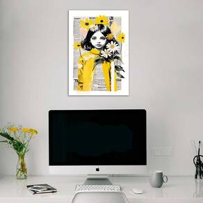 Quadro arte menina margaridas 24x18cm Cor: moldura preta Informações do produto tire todas as suas dúvidas no descritivo abaixo: decoração para quarto, sala, cozinha, escritório, área gourmet e muito mais. Chega de paredes vazias medidas - cada peça tem 24x18cm a5 . Material do papel - papel fotográfico brilhante de altíssima resolução acabamento - todos os quadros são acompanhados de uma película de acetato para proteção da imagem. - os quadros são embalados de forma segura com plástico bolha com camada dupla de acordo com o tamanho dos quadros. Garantia - garantia de 3 meses. Meu quadro chegou. Como posso fixá-lo Você precisa apenas de um martelo e um prego, pois os quadros já vão acompanhados de penduradores. Esta é a forma mais indicada. Caso prefira, você pode utilizar uma fita dupla face neste caso, sugerimos de alta qualidade para evitar que descole e seu quadro caia . Como posso limpar meu quadro A limpeza é feita como um móvel comum da sua casa. Apenas um pano seco ou espanador são suficientes para tal
