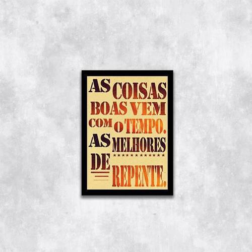 Quadro as coisas boas vem com o tempo 24x18cm Moldura: madeira preta Informações do produto tire todas as suas dúvidas no descritivo abaixo: decoração para quarto, sala, cozinha, escritório, área gourmet e muito mais. Chega de paredes vazias medidas - cada peça tem 24x18cm a5 . Material do papel - papel fotográfico brilhante de altíssima resolução acabamento - todos os quadros são acompanhados de uma película de acetato para proteção da imagem. - moldura em madeira maciça na cor branca e pendurador móvel que pode ser retirado facilmente caso deseje fixar com fita dupla face. - os quadros são embalados de forma segura com plástico bolha com camada dupla de acordo com o tamanho dos quadros. - de 3 meses prazo de envio pedimos 24 horas úteis no máximo para enviar seu pedido após o envio, segue os prazos normais dos correios, cerca de 7 exceto para norte e nordeste, que pode ser de até 14 . Em diversas cidades, este prazo normalmente é reduzido, mas depende do prazo dos correios. Meu quadro chegou. Como posso fixá-lo Você precisa apenas de um martelo e um prego, pois os quadros já vão acompanhados de penduradores. Esta é a forma mais indicada. Caso prefira, você pode utilizar uma fita dupla face neste caso, sugerimos de alta qualidade para evitar que descole e seu quadro caia . Como posso limpar meu quadro A limpeza é feita como um móvel comum da sua casa. Apenas um pano seco ou espanador são suficientes para tal