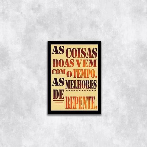 Quadro as coisas boas vem com o tempo 33x24cm - com vidro Moldura: madeira preta Informações do produto tire todas as suas dúvidas no descritivo abaixo: decoração para quarto, sala, cozinha, escritório, área gourmet e muito mais. Chega de paredes vazias medidas - cada peça tem 33x24cm a4 . Material do papel - papel fotográfico brilhante de altíssima resolução acabamento - todos os quadros são acompanhados de vidro para proteção da imagem. - moldura em madeira maciça na cor preta e pendurador . - os quadros são embalados de forma segura com plástico bolha com camada dupla de acordo com o tamanho dos quadros. Garantia - garantia de 3 meses. Meu quadro chegou. Como posso fixá-lo Você precisa apenas de um martelo e um prego, pois os quadros já vão acompanhados de penduradores. Esta é a forma mais indicada. Como posso limpar meu quadro A limpeza é feita como um móvel comum da sua casa. Apenas um pano seco ou espanador são suficientes para tal Ean: 7895142221580