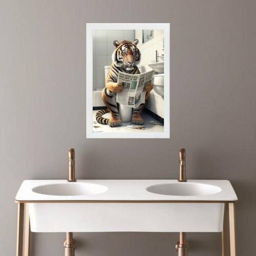 Quadro banheiro coleção animais - tigre 45x34cm Moldura: madeira branca Informações do produto tire todas as suas dúvidas no descritivo abaixo: decoração para quarto, sala, cozinha, escritório, área gourmet e muito mais. Chega de paredes vazias. Medidas - cada peça tem 45x34cm a3 . Material do papel - papel fotográfico brilhante de altíssima resolução acabamento - todos os quadros são acompanhados de uma película de acetato para proteção da imagem. - os quadros são embalados de forma segura com plástico bolha com camada dupla de acordo com o tamanho dos quadros. Garantia - garantia de 3 meses. Meu quadro chegou. Como posso fixá-lo Você precisa apenas de um martelo e um prego, pois os quadros já vão acompanhados de penduradores. Esta é a forma mais indicada. Caso prefira, você pode utilizar uma fita dupla face neste caso, sugerimos de alta qualidade para evitar que descole e seu quadro caia . Como posso limpar meu quadro A limpeza é feita como um móvel comum da sua casa. Apenas um pano seco ou espanador são suficientes para tal
