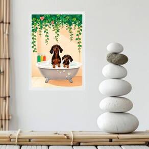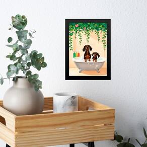 Quadro banheiro dachshunds na banheira 45x34cm Cor: moldura preta Informações do produto tire todas as suas dúvidas no descritivo abaixo: decoração para quarto, sala, cozinha, escritório, área gourmet e muito mais. Chega de paredes vazias. Medidas - cada peça tem 45x34cm a3 . Material do papel - papel fotográfico brilhante de altíssima resolução acabamento - todos os quadros são acompanhados de uma película de acetato para proteção da imagem. - os quadros são embalados de forma segura com plástico bolha com camada dupla de acordo com o tamanho dos quadros. Garantia - garantia de 3 meses. Meu quadro chegou. Como posso fixá-lo Você precisa apenas de um martelo e um prego, pois os quadros já vão acompanhados de penduradores. Esta é a forma mais indicada. Caso prefira, você pode utilizar uma fita dupla face neste caso, sugerimos de alta qualidade para evitar que descole e seu quadro caia . Como posso limpar meu quadro A limpeza é feita como um móvel comum da sua casa. Apenas um pano seco ou espanador são suficientes para tal