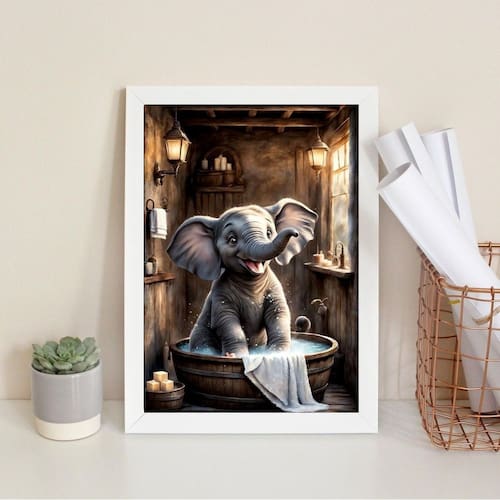 Quadro banheiro elefantinho tomando banho 33x24cm Cor: moldura preta Informações do produto tire todas as suas dúvidas no descritivo abaixo: decoração para quarto, sala, cozinha, escritório, área gourmet e muito mais. Chega de paredes vazias medidas - cada peça tem 33x24cm a4 . Material do papel - papel fotográfico brilhante de altíssima resolução acabamento - todos os quadros são acompanhados de uma película de acetato para proteção da imagem. - os quadros são embalados de forma segura com plástico bolha com camada dupla de acordo com o tamanho dos quadros. Garantia - garantia de 3 meses. Meu quadro chegou. Como posso fixá-lo Você precisa apenas de um martelo e um prego, pois os quadros já vão acompanhados de penduradores. Esta é a forma mais indicada. Caso prefira, você pode utilizar uma fita dupla face neste caso, sugerimos de alta qualidade para evitar que descole e seu quadro caia . Como posso limpar meu quadro A limpeza é feita como um móvel comum da sua casa. Apenas um pano seco ou espanador são suficientes para tal