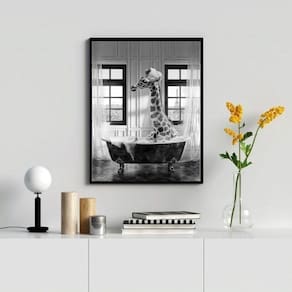 Quadro banheiro girafa tomando banho 24x18cm - com vidro Cor: moldura branca Informações do produto tire todas as suas dúvidas no descritivo abaixo: decoração para quarto, sala, cozinha, escritório, área gourmet e muito mais. Chega de paredes vazias medidas - cada peça tem 24x18cm a5 . Material do papel - papel fotográfico brilhante de altíssima resolução acabamento - todos os quadros são acompanhados de vidro para proteção da imagem. - moldura em madeira maciça na cor preta ou branca conforme produto escolhido e pendurador . - os quadros são embalados de forma segura com plástico bolha com camada dupla de acordo com o tamanho dos quadros. Garantia - garantia de 3 meses. Meu quadro chegou. Como posso fixá-lo Você precisa apenas de um martelo e um prego, pois os quadros já vão acompanhados de penduradores. Esta é a forma mais indicada. Como posso limpar meu quadro A limpeza é feita como um móvel comum da sua casa. Apenas um pano seco ou espanador são suficientes para tal