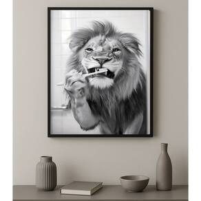 Quadro Banheiro Leão Escovando Dentes 45x34cm - com vidro - Cor: Moldura preta