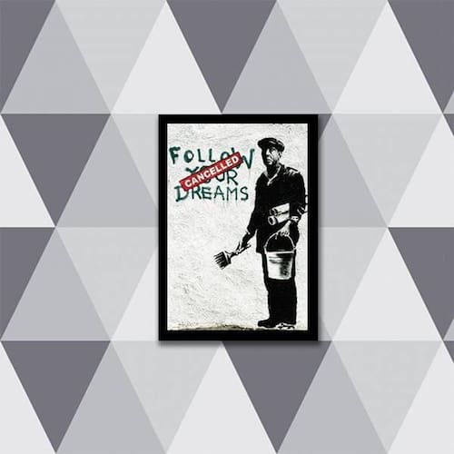 Quadro Banksy Follow Your Dreams 24X18Cm Moldura: madeira branca Informações do produto Decoração para quarto, sala, cozinha, escritório, área gourmet e muito mais. Chega de paredes vazias. Medidas - cada peça tem 24x18cm a5 . Material do papel - papel fotográfico brilhante de altíssima resolução Acabamento - todos os quadros são acompanhados de uma película de acetato para proteção da imagem. - moldura em madeira maciça na cor branca e pendurador móvel que pode ser retirado facilmente caso deseje fixar com fita dupla face. - os quadros são embalados de forma segura com plástico bolha com camada dupla de acordo com o tamanho dos quadros. - de 3 meses Meu quadro chegou. Como posso fixá-lo: Você precisa apenas de um martelo e um prego, pois os quadros já vão acompanhados de penduradores. Esta é a forma mais indicada. Caso prefira, você pode utilizar uma fita dupla face neste caso, sugerimos de alta qualidade para evitar que descole e seu quadro caia . Como posso limpar meu quadro: A limpeza é feita como um móvel comum da sua casa. Apenas um pano seco ou espanador são suficientes para tal Marca: Não Informado Ean: 7892091051053