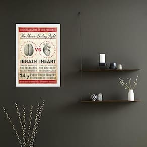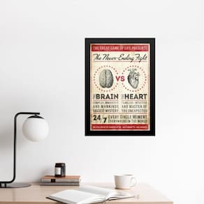 Quadro batalha cérebro x coração 45x34cm Moldura: madeira branca Informações do produto tire todas as suas dúvidas no descritivo abaixo: decoração para quarto, sala, cozinha, escritório, área gourmet e muito mais. Chega de paredes vazias. Medidas - cada peça tem 45x34cm a3 . Material do papel - papel fotográfico brilhante de altíssima resolução acabamento - todos os quadros são acompanhados de uma película de acetato para proteção da imagem. - os quadros são embalados de forma segura com plástico bolha com camada dupla de acordo com o tamanho dos quadros. Garantia - garantia de 3 meses. Meu quadro chegou. Como posso fixá-lo Você precisa apenas de um martelo e um prego, pois os quadros já vão acompanhados de penduradores. Esta é a forma mais indicada. Caso prefira, você pode utilizar uma fita dupla face neste caso, sugerimos de alta qualidade para evitar que descole e seu quadro caia . Como posso limpar meu quadro A limpeza é feita como um móvel comum da sua casa. Apenas um pano seco ou espanador são suficientes para tal
