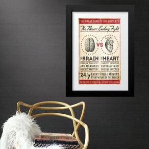 Quadro batalha cérebro x coração - 60x48cm Moldura: madeira preta Informações do produto tire todas as suas dúvidas no descritivo abaixo: decoração para quarto, sala, cozinha, escritório, área gourmet e muito mais. Chega de paredes vazias medidas - cada peça tem 60x48cm . Material do papel - papel fotográfico brilhante de altíssima resolução acabamento - todos os quadros são acompanhados de vidro para proteção da imagem. - moldura em madeira maciça na cor preta ou branca conforme produto escolhido e pendurador. - paspatur branco com 7cm de largura - os quadros são embalados de forma segura com plástico bolha com camada dupla de acordo com o tamanho dos quadros. Garantia - garantia de 3 meses. Meu quadro chegou. Como posso fixá-lo Você precisa apenas de um martelo e um prego, pois os quadros já vão acompanhados de penduradores. Esta é a forma mais indicada. Como posso limpar meu quadro A limpeza é feita como um móvel comum da sua casa. Apenas um pano seco ou espanador são suficientes para tal