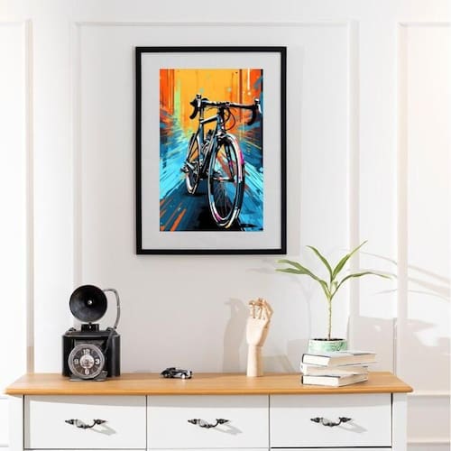 Quadro bicicleta abstrata - 60x48cm Cor: moldura preta Informações do produto tire todas as suas dúvidas no descritivo abaixo: decoração para quarto, sala, cozinha, escritório, área gourmet e muito mais. Chega de paredes vazias medidas - cada peça tem 60x48cm . Material do papel - papel fotográfico brilhante de altíssima resolução acabamento - todos os quadros são acompanhados de vidro para proteção da imagem. - moldura em madeira maciça na cor preta ou branca conforme produto escolhido e pendurador. - paspatur branco com 7cm de largura - os quadros são embalados de forma segura com plástico bolha com camada dupla de acordo com o tamanho dos quadros. Garantia - garantia de 3 meses. Meu quadro chegou. Como posso fixá-lo Você precisa apenas de um martelo e um prego, pois os quadros já vão acompanhados de penduradores. Esta é a forma mais indicada. Como posso limpar meu quadro A limpeza é feita como um móvel comum da sua casa. Apenas um pano seco ou espanador são suficientes para tal