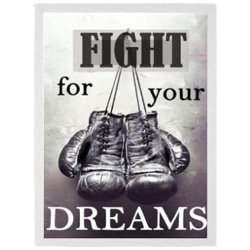 O Quadro Decorativo Boxe Fight For Your Dreams 24 x 18 Cm A5 é perfeito para a decorar o seu ambiente de forma moderna e charmosa. O quadro é fácil de instalar pois vai acompanhado de pendurador e simples de limpar, apenas um pano seco ou espanador é suficiente para manter o seu quadro conservado. Características: - O papel fotográfico possui alta resolução - Acompanha vidro para proteção da imagem - Fácil de instalar Especificações Marca: Quadros On-Line Temática do quadro: tema Modelo: Boxe Fight For Your Dreams Material do papel: Fotográfico brilhante Material da moldura: Madeira Acompanha moldura: Sim Acompanha vidro: Sim Acompanha pendurador: Sim Cor da moldura: Branca Medidas: 24 x 18 cm : 3 meses Itens inclusos 01 Quadro Decorativo Boxe Fight For Your Dreams 24 x 18 Cm Sobre a Quadros On-Line Criada há mais de 30 anos em Belo Horizonte, a Quadros On-Line é uma referência na cidade, sempre prezando a criação de produtos de alta qualidade e excelência no atendimento. Além dos artigos decorativos, confecciona e comercializa obras de arte também.