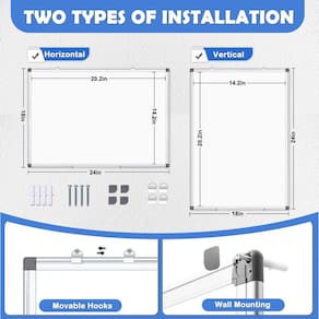 ?Pacote super econômico?O quadro branco apagável a seco de 24 x 18 polegadas vem com 4 marcadores magnéticos apagáveis a seco (incluindo 4 cores), 6 ímãs, 1 bandeja móvel, 1 borracha a seco. Você pode optar por montar a placa apagável a seco firmemente na parede com 4 ganchos móveis ou 4 parafusos de parede e 4 tampas de âncoras.